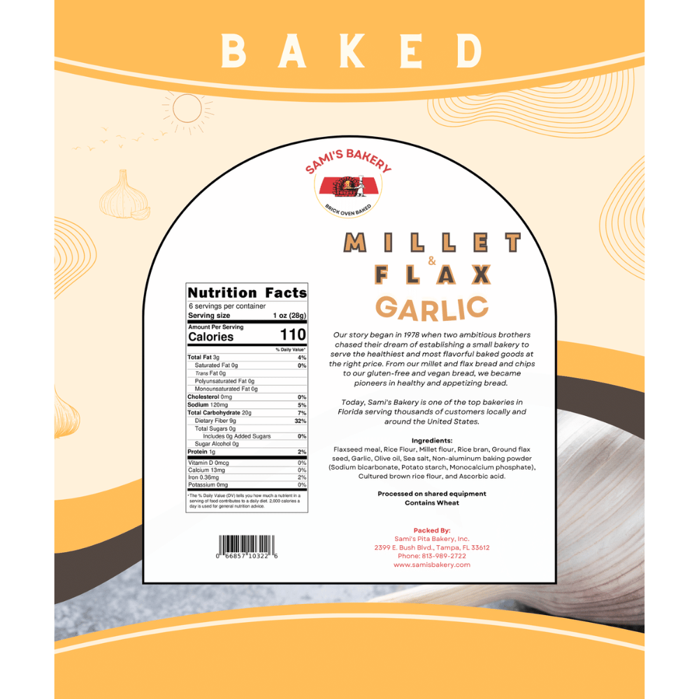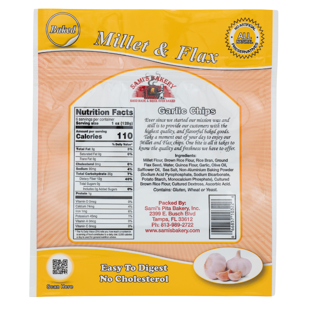 Flax seed Meal, Rice Flour, Millet Flour, Rice Bran ,Ground Flax Seed, Garlic, Olive Oil, Sea Salt, Non Aluminum Baking Powder (Sodium Acid Pyrophophate,Soduim Bicarbonate,Potato Starch, Monocalcium Phosphate)Cultured Brown Rice Flour, Ascorbic acid